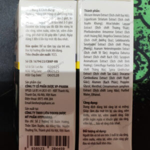– Dịch chiết Đại Hồi, Dịch chiết Xuyên Khung, Dịch chiết Thương Truật, Dịch chiết Hoàng Bá, Dịch chiết Đương Quy, Dịch chiết Phòng Phong, Dịch chiết Tế Tân, Dịch chiết Bạch chỉ, Dịch chiết Đinh Hương, Dịch chiết Thăng Ma, Dịch chiết Tạo Giác, Dịch chiết Huyết Giác, Bạch Phàn, Propylen Glycol, Menthol, Dịch chiết Long não, Nước tinh khiết, Ethanol.