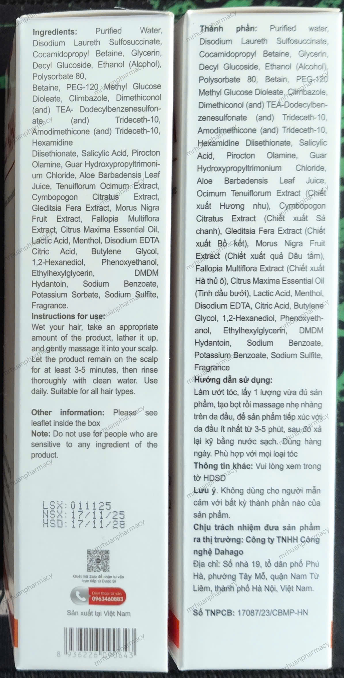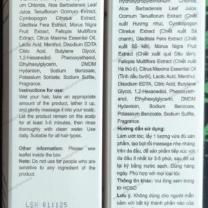 – Chiết xuất hương nhu, chiết xuất sả chanh, chiết xuất bồ kết, chiết xuất bưởi, Climbazole, Fludipure 8G, Cocamido propyl betain, Sodium lauryl ether sulfat, PEG-40 hydrogenate castor oil, Polyquartenium – 10, Acid citric, Sodium benzoate, Ethanol, Tetra sodium benzoate, Ethanol, Tetra sodium edetate, Piroctone olamin, Phenoxyethanol, Ethylhexyl glycerin, Fragrance, nước tinh khiết vừa đủ.