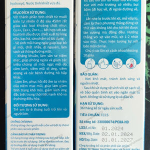 – Với thành phần tinh chiết từ muối biển tự nhiên ở độ sâu 450m rất giàu các loại khoáng chất như: Cu++, Ca++, Zn++,… kết hợp với các loại tinh dầu được chiết xuất từ long não, bạc hà, sản phẩm có tác dụng: