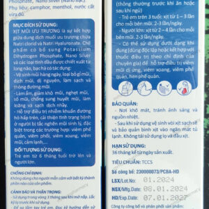– Xịt mũi ưu trương là sự kết hợp giữa dung dịch nước muối ưu trương chứa Natri clorid và Natri hyaluronate. Chế phẩm có bổ sung Potassium Dihydrogen Phosphate, Nano bạc và các loại tinh dầu được chiết xuất từ long não, bạc hà có tác dụng:
