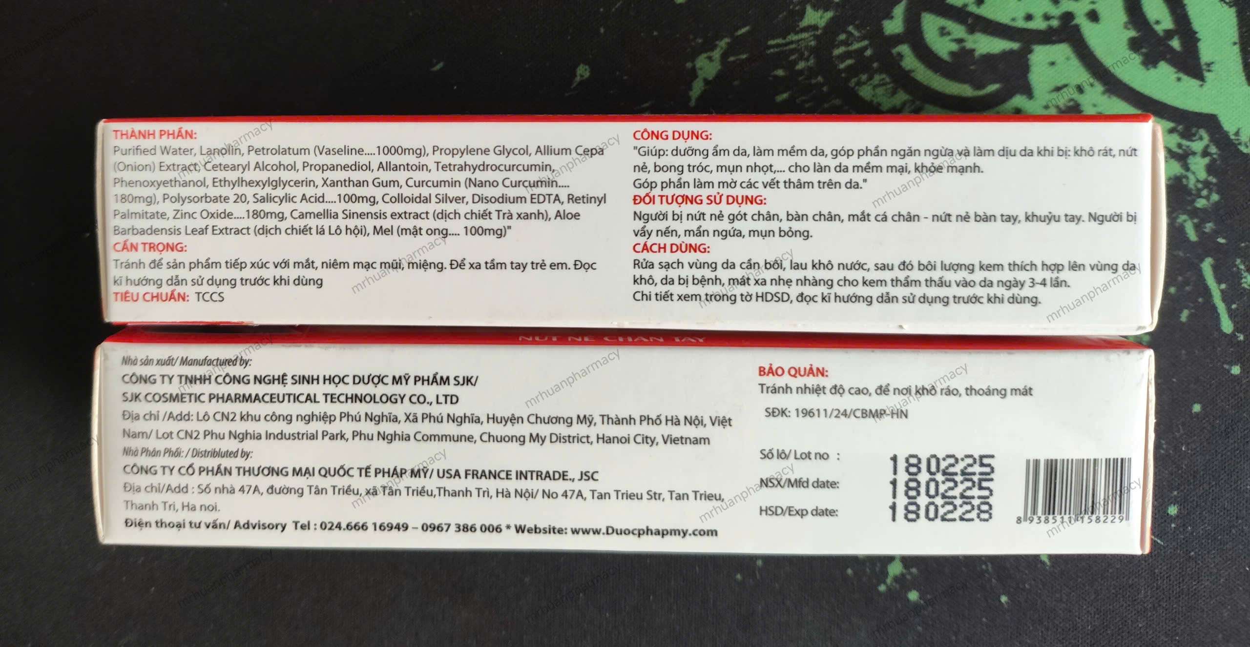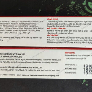 – Lanolin, Vaseline, Propylene Glycol, Allium Cepa (onion) Extract, Cetearyl Alcohol, Propanediol, Allantoin, Tetrahydrocurcumin, Phenoxyethanol, Ethylhexylgelycerin, Xanthan Gum, Curcumin, Polysorbat 20, Acid salicylic, Nano bạc, Disodium EDTA, Retinyl Palmitate, Zinc Oxide, Dịch chiết Trà xanh, Dịch chiết Lô hội, Mật ong, Nước tinh khiết vừa đủ 20g.